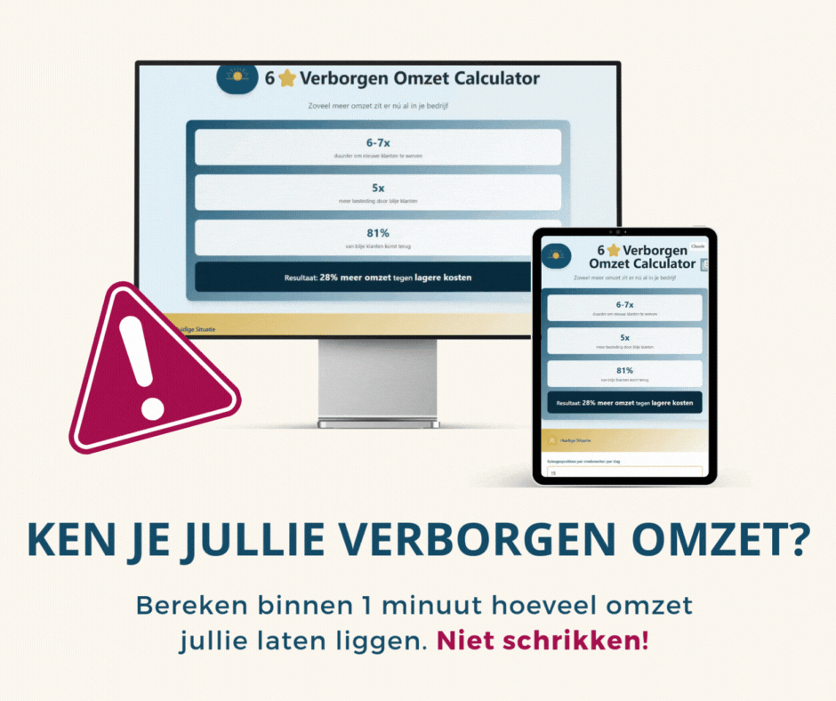 Waarom deze pilot er nu isWe willen laten zien hoe de 6⭐ Klantreis in recordtempo meer omzet en loyale klanten oplevert – zonder korting en zonder extra marketingbudget. Met deze pilot verzamelen we nog meer praktijkvoorbeelden en feedback om het programma nóg scherper en krachtiger te maken. Jullie succes is ons bewijs. | ![]() |